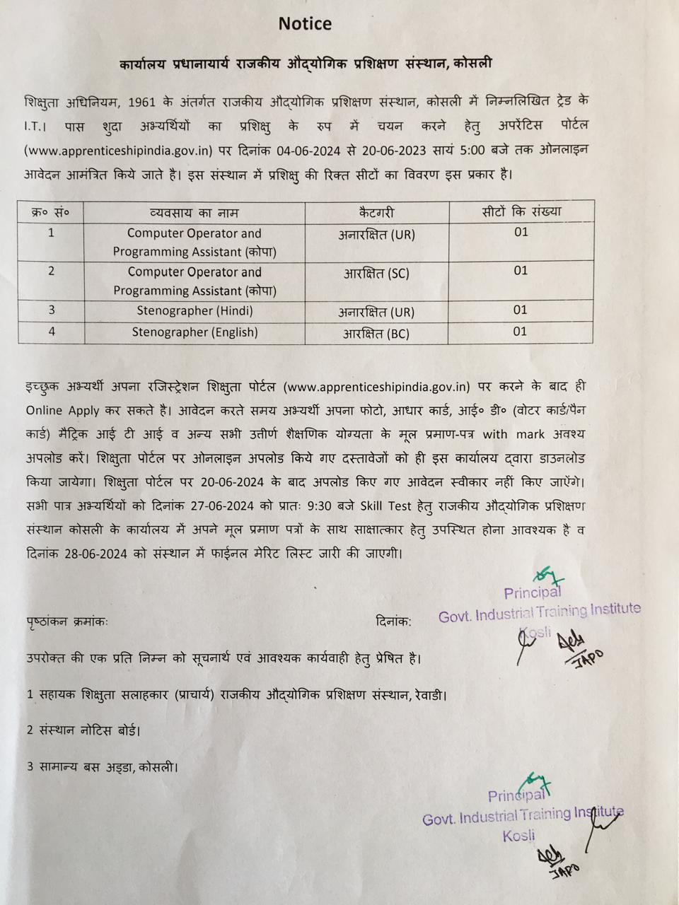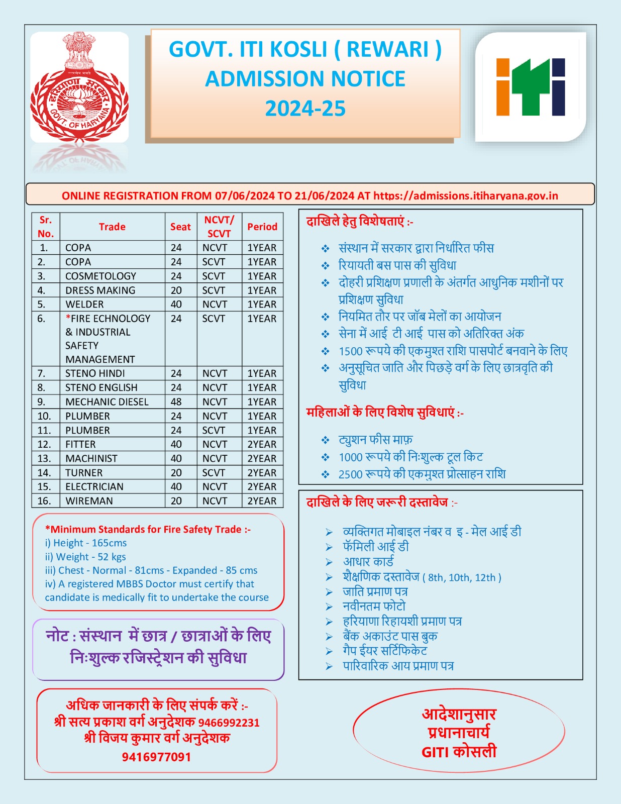 ITI Kosli is running in vast area of about 12 acres having large play grounds, lush green all around covered with trees and plants. Has beautiful park flowering the essence of flowers and hereby. Institute workshops with modern machinery, airy Classroom with sufficient place